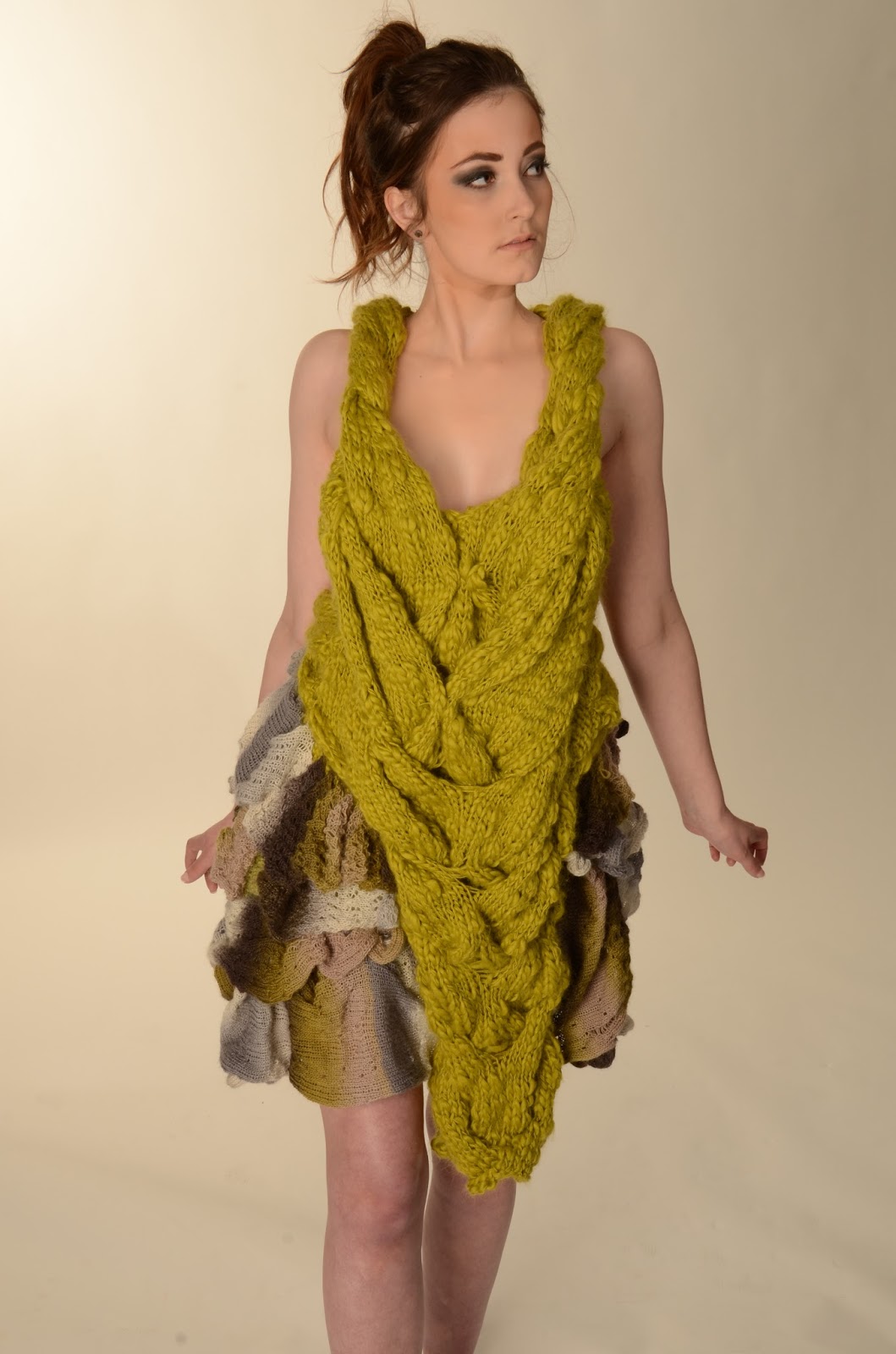 This was an elective project and a selection of 2nd year Fashion students, working in teams, designed and produced six pieces for display. The pieces were made with a combination of hand knitting & machine knitting techniques, using a selection of yarns from the ‘Austermann’ hand knitting range.
