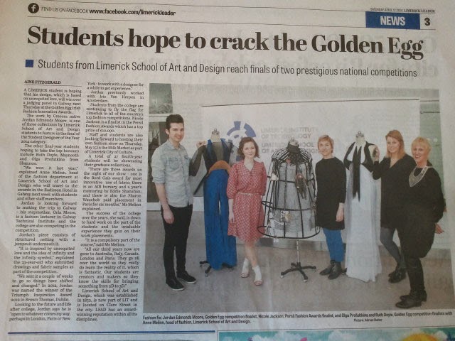 Final year students Jordan Edmonds-Moore, Olga Profutkina and Ruth Doyle will be representing LSAD at the Golden Egg Awards which will be taking place in Galway on 17th April. Nicole Jackson is also through to t he finals of the Persil awards.